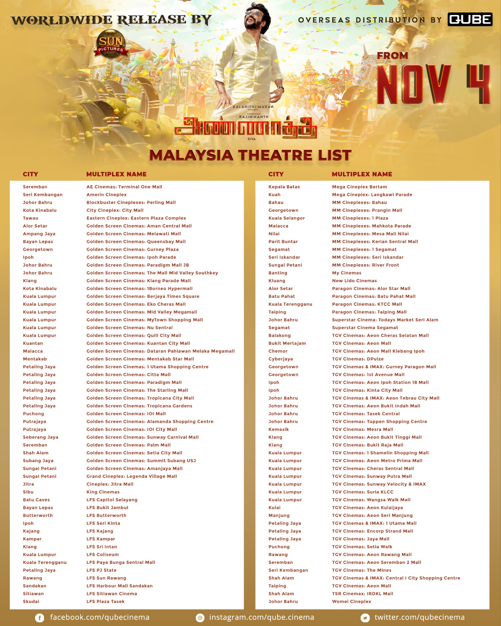 Qube Cinema On Twitter Theatre List For Annaatthe Release In Malaysia Go Here For A Full List Of Overseas Theatres Https T Co 59vjo6wmz3 Rajinikanth Directorsiva Keerthyofficial Immancomposer Prakashraaj Khushsundar Sooriofficial